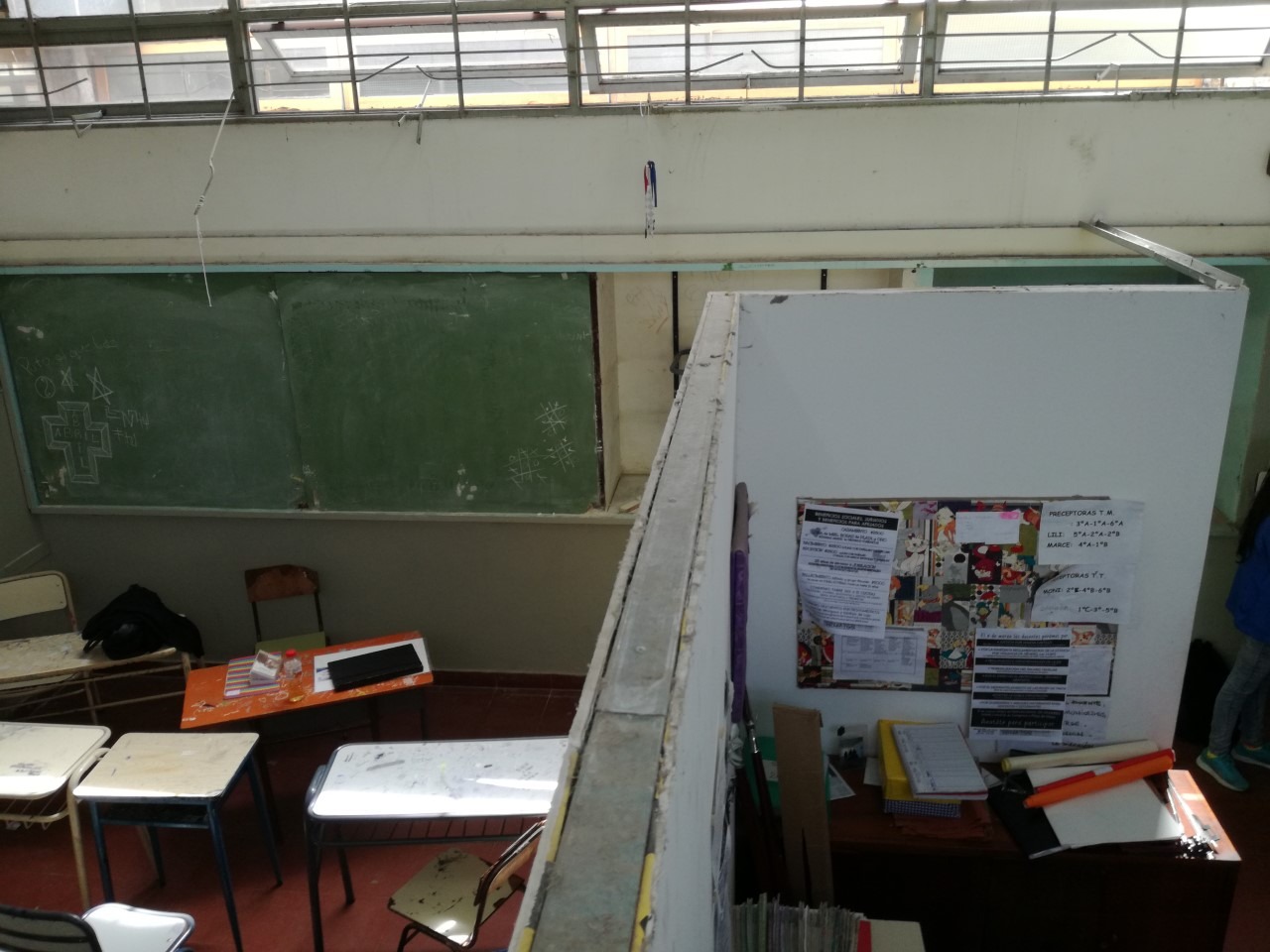 Mientras esperamos alguna respuesta, los casi 700 alumnos que tenemos cursan en las peores condiciones imaginables. Las aulas están divididas entre sí por paredes improvisadas de durlock lo cual hace imposible dar correctamente clase. En ellas no hay ventiladores ni calefacción, sí sobran filtraciones de agua que provocan que se inunde el colegio cada vez que llueve. Los alumnos y alumnas de secundaria tienen que usar baños químicos que se encuentran en la pequeña porción de patio que nos quedó ¿y cuando llueve? También ¿y durante el recreo de primaria? Nos aguantamos. De nuestro comedor, el cual da desayuno, almuerzo y merienda, sólo pueden usarse dos bachas para lavar porque las demás se tapan desde que la obra está en construcción.
