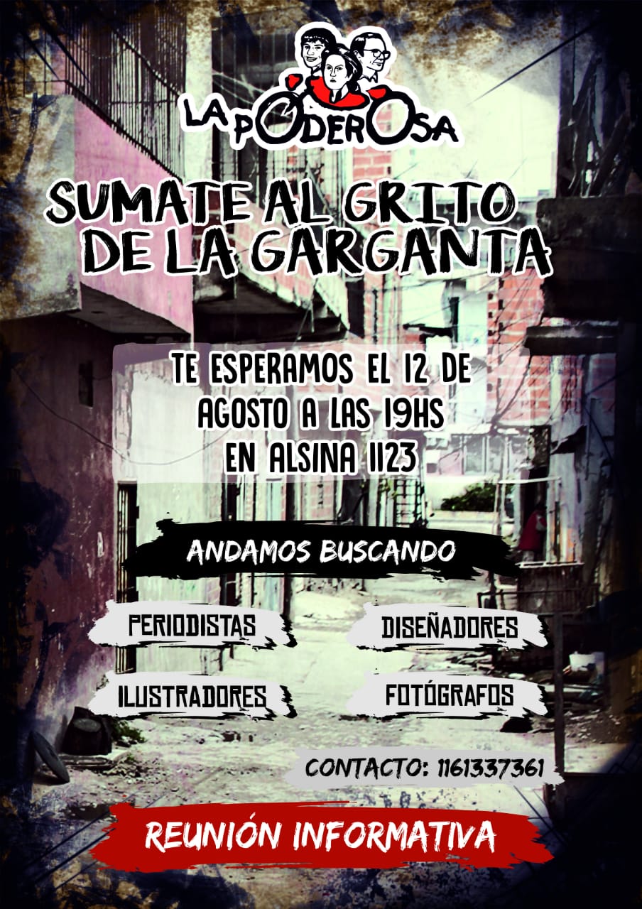 Cada vez son más necesarias gargantas que quieran sumarse a este colectivo de comunicación. Los espacios de comunicación popular de las villas de Capital Federal necesitamos periodistas, diseñadoras, fotógrafos, editoras, ilustradores y personas con capacidad de creación y muchas ganas de luchar contra la desinformación.