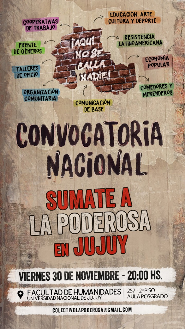 El viernes 30 de noviembre a las 20 hs, en la Facultad de Humanidades de la Universidad Nacional de Jujuy, ubicada en calle Otero 257, 2° piso, Aula Posgrado, llevaremos a cabo una reunión de convocatoria provincial de la organización barrial La Poderosa. En la misma participaremos integrantes de la organización, y estará destinada a quienes quieran conocer más acerca del trabajo que realizan en la Provincia, y a quienes quieran sumarse al trabajo voluntario.