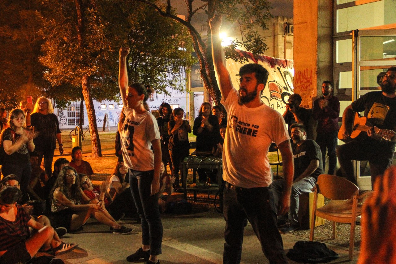 El pasado miércoles 12, en el aula Paola Sosa de la Facultad de Ciencias Sociales, se llevó a cabo la jornada “Facundo Rivera Alegre, desaparecido en democracia. Las deudas del Estado”. Donde se presentó el tráiler del documental “Facundo Rivera Alegre. Desaparecido”, se pintó un mural por nuestros desaparecidos, y se hicieron lecturas de poesías y un cierre musical.