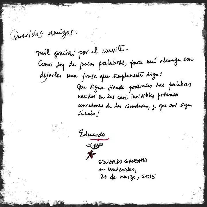 El 20 de marzo de 2015 llegó un mail al correo de La Garganta que nos dejó patas arriba de alegría: el prólogo para nuestro primer libro, escrito con su puño y letra, con la forma de América Latina.