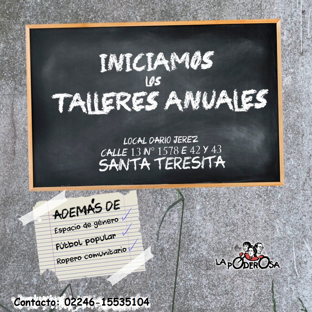 En el local “Darío Jerez” del barrio Las Quintas, en Santa Teresita, iniciamos los talleres anuales donde entre vecinos compartimos nuestros aprendizajes para seguir construyendo enseñanzas colectivas. Además de continuar con el Fútbol Popular y el Merendero para el piberío los miércoles y sábados desde las 17hs. decidimos en Asamblea abrir las puertas de un local en el corazón del barrio para tejer redes y alfabetizar la condición humana: el ser cooperativo y compañero.