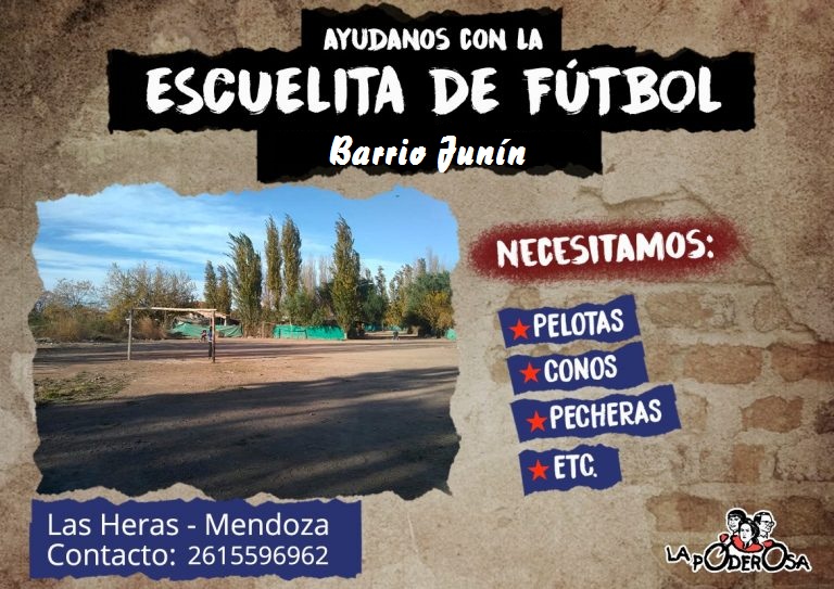 Nuestro objetivo es que vecinos y vecinas del Barrio Junín de Las Heras o popularmente conocido como «Villa Chorizo», nos encontremos y conozcamos, saber de nuestras historias, jugar en equipo, hacer goles, gritar muy fuerte y así de esta manera poder armar nuestra “Escuelita de Fútbol Popular”.