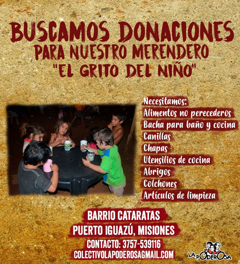 En la incipiente asamblea poderosa del Barrio Cataratas, en la ciudad de Puerto Iguazú, las vecinas y los vecinos llevamos adelante a pura garra y corazón el funcionamiento del merendero «El Grito del Niño» para la gurisada del barrio. Este merendero crece día a día a base de organización, solidaridad y compromiso para seguir fortaleciendo el espacio a través de la colaboración de todas y todos. Por eso, invitamos a que se sumen a empujar este proyecto.