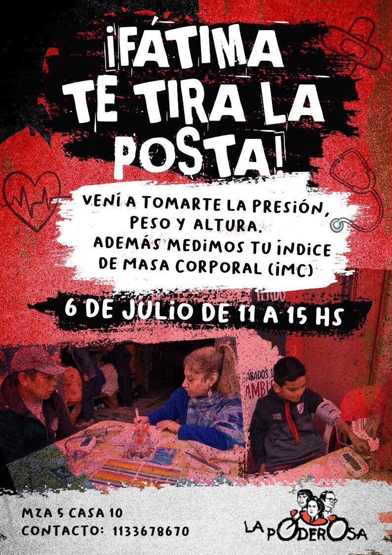 Con organización llevamos a cabo la primera posta de salud, instancia en la que nosotras, las promotoras, salimos al barrio y tomamos la presión arterial, charlamos sobre alimentación saludable, la importancia de la actividad física y difundimos información del CeSAC del barrio, entre otras actividades. También hacemos relevamientos, para conocer la situación de salud en nuestro barrio, y qué tan garantizados están los derechos.