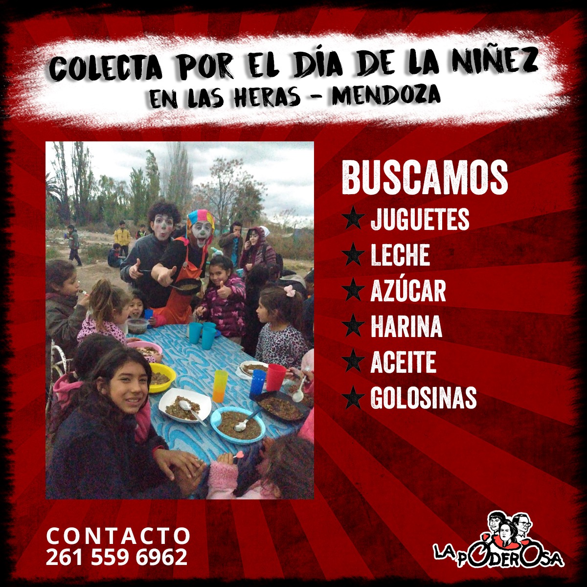 Para colaborar con el festejo solidario podes acercar tus donaciones de leche, chocolate, harina, aceite, frutas, golosinas, juegos, juegos didácticos o de mesa y cotillón, a través del teléfono 261 559-6962