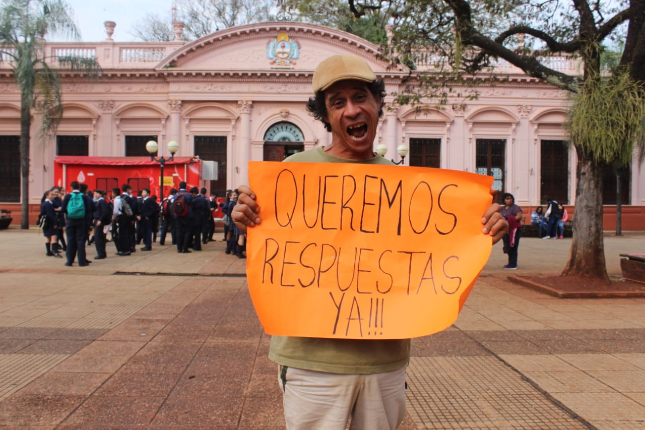Un grupo de sesenta familias, compañeras y compañeros de distintas localidades que atravesamos la misma situación, estamos acampando desde el 5 de agosto frente a la Casa de Gobierno de Posadas. Ese día entregamos allí un petitorio destinado al Gobernador de la Provincia, Hugo Pasalacqua. En él pedíamos trabajo, herramientas para producir nuestras huertas, ganaderías y panaderías y un aumento de sueldo. La contestación fue: «en una semana les daremos respuestas».