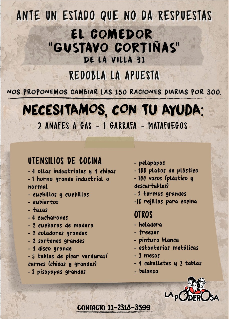 Todos los días, aunque el sol nos calcine, la lluvia nos inunde y la desidia estatal nos empobrezca, en la Villa 31 nos organizamos para que el hambre no crezca. Por eso, desde el comedor “Gustavo Cortiñas“ llevamos un plato de comida caliente a las familias que no llegan a bancarlo. Hoy en día, preparamos 150 raciones por día, pero muchos vecinos y vecinas están en lista de espera, ¡por eso necesitamos llegar a las 300!