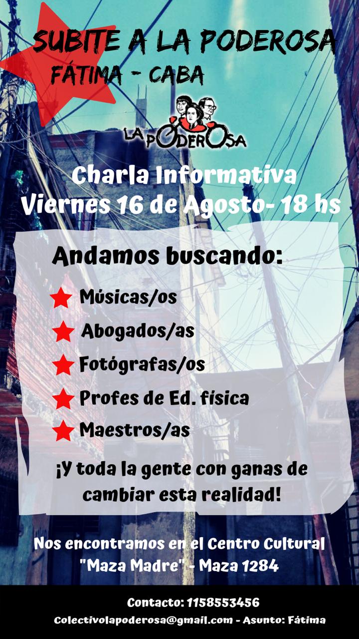 Desde la asamblea de Fátima, Villa Soldati, te esperamos este viernes 16 de agosto a las 18hs en el centro cultural Maza Madre (Maza 1284 – Boedo.), para subirte a esta moto poderosa.