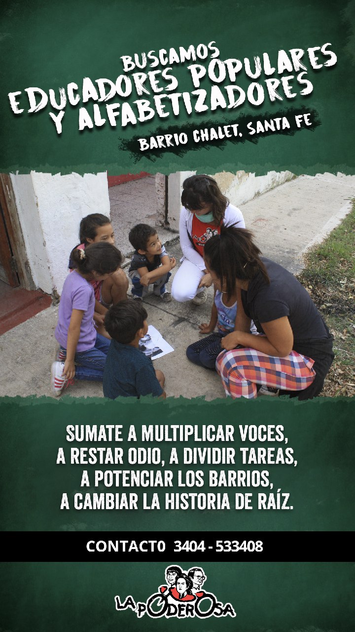 En Barrio Chalet nos organizamos para transformar la realidad con educación popular. Porque todavía hay vecinas y vecinos sin alfabetizar, necesitamos educadoras y educadores con voluntad, que aporten su granito de arena para combatir la desigualdad. La educación es nuestra herramienta para la libertad. Por eso, ¡sumate a La Poderosa!