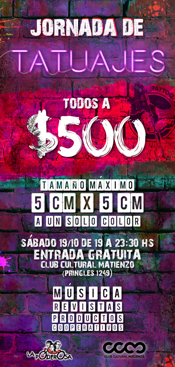 Los invitamos a la “Jornada Solidaria de Tatuajes”, el sábado 19 de octubre, de 19 a 23.30hs, en el Centro Cultural Matienzo, Pringles 1249, entrada gratuita.