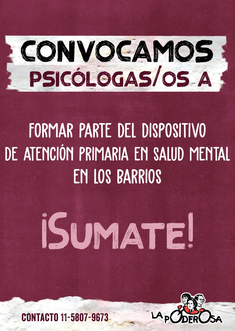 Por eso convocamos a profesionales psicólogas y psicólogos que quieran formar parte de un dispositivo territorial para abordar las problemáticas de salud mental que atravesamos en los barrios, mientras seguimos luchando por un sistema de salud pública con un presupuesto acorde, que pueda cubrir las demandas de quienes somos usuarios del mismo, a través de un trabajo articulado con el mismo territorio.
