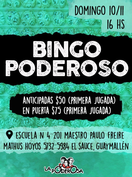 Desde el espacio de educación popular nos organizamos y armamos un gran bingo que nos ayudará en la autogestión de nuestros espacios: alfabetización de adultas y adultos, acompañamiento educativo y taller de educación popular para la niñez. Creemos que la educación es transformadora y apostamos a la transformación desde lo colectivo, por eso te invitamos a ser parte el domingo 10 de noviembre a las 16 horas en la escuela Paulo Freire (Mathus Hoyos 5732- 5984). Haremos un bingo poderoso, así como sorteos, venta de cosas dulces, panchos y bebidas.