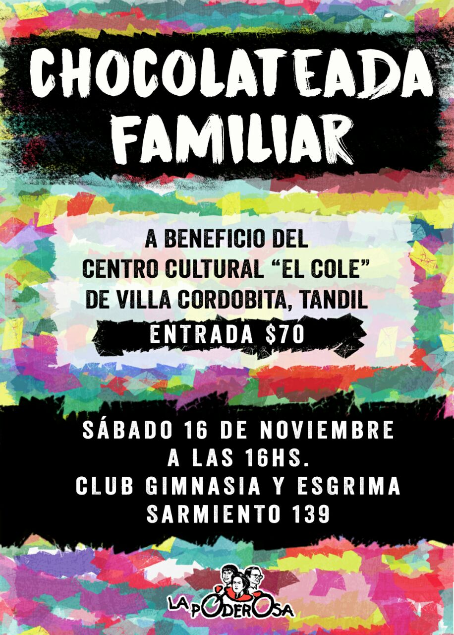 Para recaudar fondos y seguir fogoneando nuestros talleres y espacios de alimentación, los y las invitamos a participar de esta gran chocolateada que se realizará el sábado 16 de noviembre a las 16 hs en el Club Gimnasia y Esgrima, ubicado en Sarmiento 139.