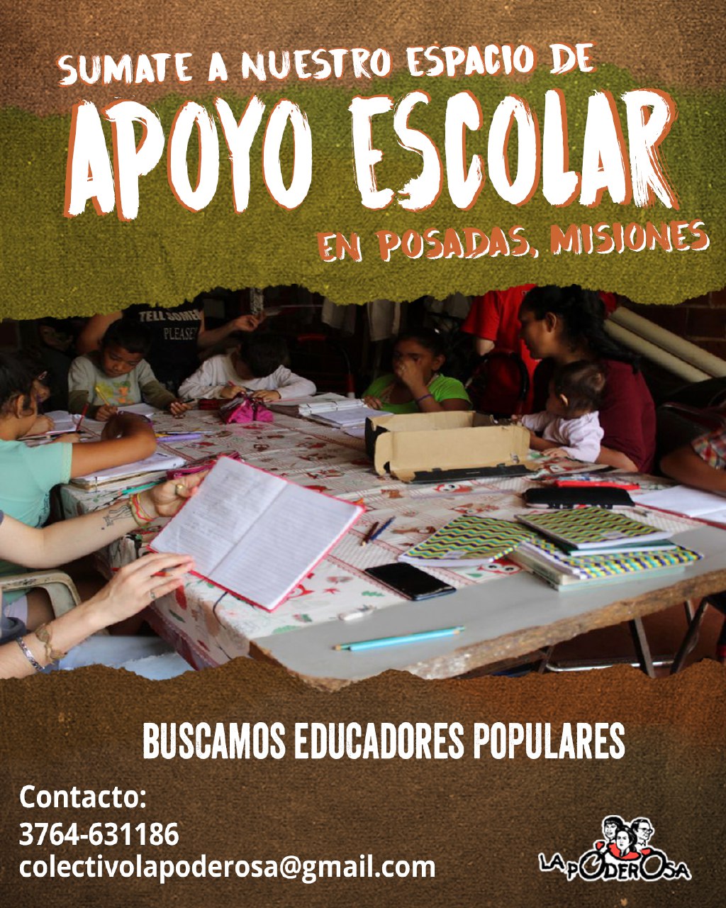 En la asamblea poderosa de la Chacra 159 de Villa Cabello, en Posadas, viene caminando el espacio de Apoyo Escolar que funciona los días miércoles de 17:30 a 19:30 hs y los días sábados de 10:00 a 12:00hs. En este espacio enseñamos y aprendemos junto a la gurisada; construimos conocimientos colectivos, diferenciandonos de los métodos tradicionales que se anclan en la transferencia de conocimientos de manera rígida. Entedendemos que la educación popular es una herramienta fundamental para generar saberes integrales, así como fortalecer la trayectoria escolar y la integración barrial.