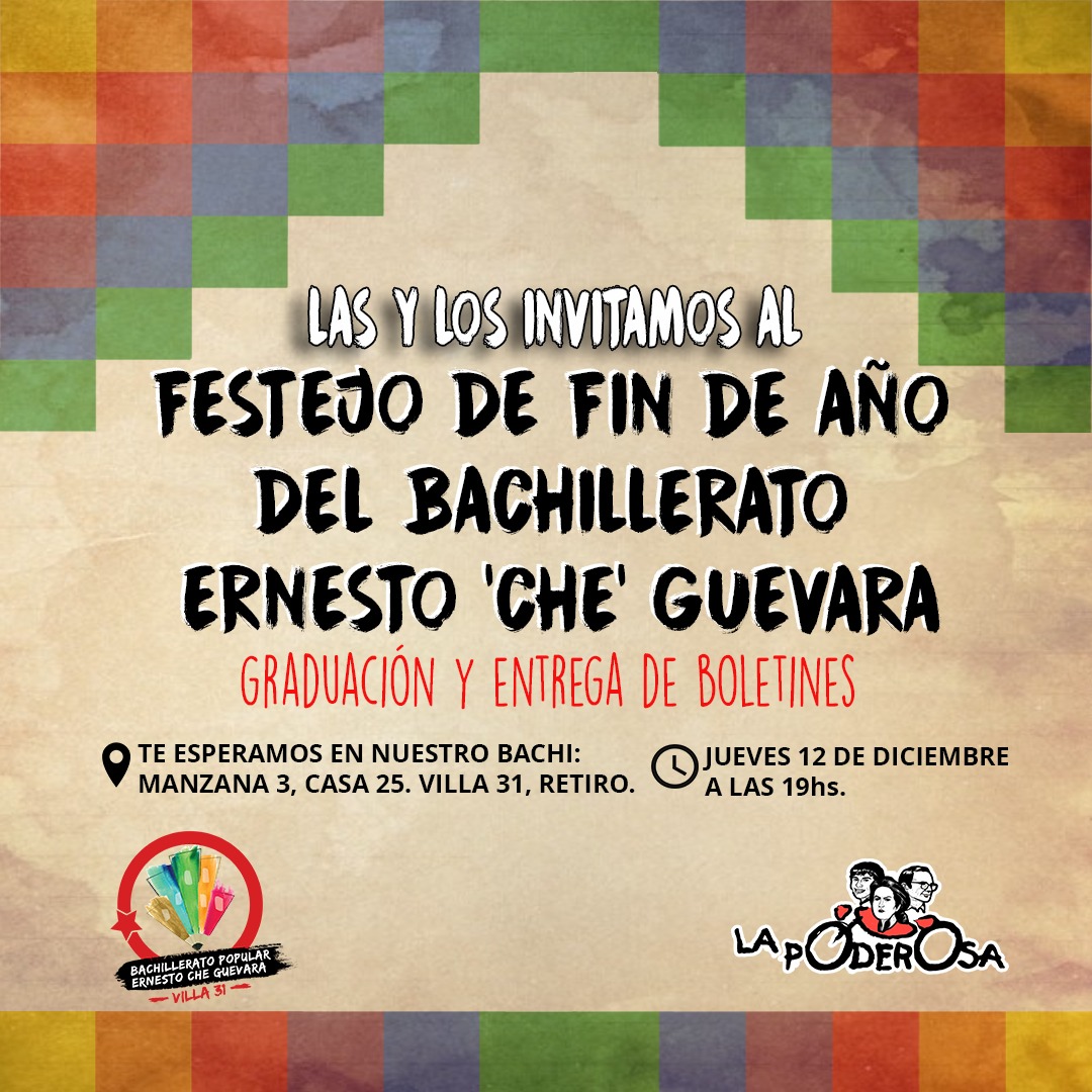 Porque entendemos que es el arma más poderosa para transformar nuestra realidad, construimos nuestro Bachi día a día, y ya cumplimos 4 años, recorriendo esta utopía. Este jueves 12 de diciembre el Bachillerato Popular «Ernesto ‘Che’ Guevara» de la Villa 31 realizará su acto de fin de año, celebrando la graduación de 10 vecinas y vecinos, a las 19 horas. Están todas y todos invitados, ¡los esperamos!