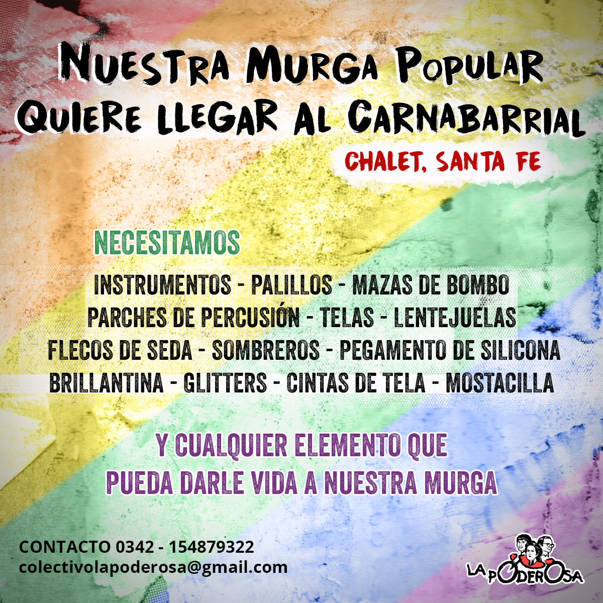 En Chalet, en Santa Fe, sobrevivimos al agua, al dengue y a la desidia estatal. Ahora, con la cabeza en alto, estamos construyendo nuestra murga y queremos llegar al Carnabarrial. Para eso, necesitamos todo tipo de elementos: instrumentos, palillos, mazas de bombo, parches de percusión, telas, lentejuelas, flecos de seda, sombreros, pegamento de silicona, brillantina, glitter, cintas de tela y mostacilla.