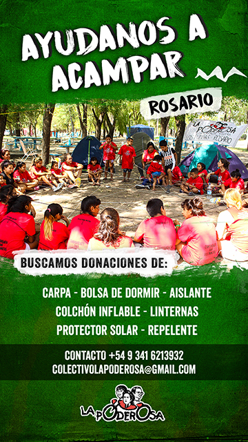 A pulmón, con mucha garra y organización, este 18 de enero nos iremos de campamento para encontranos quienes todo el año participamos de los talleres en nuestros barrios. Nos sobran las ganas, la alegría, las expectativas y la ilusión, pero nos faltan algunas cositas en la que nos podés ayudar vos: necesitamos carpas, bolsas de dormir, repelente, protector solar, aislante, colchón inflable y linternas.
