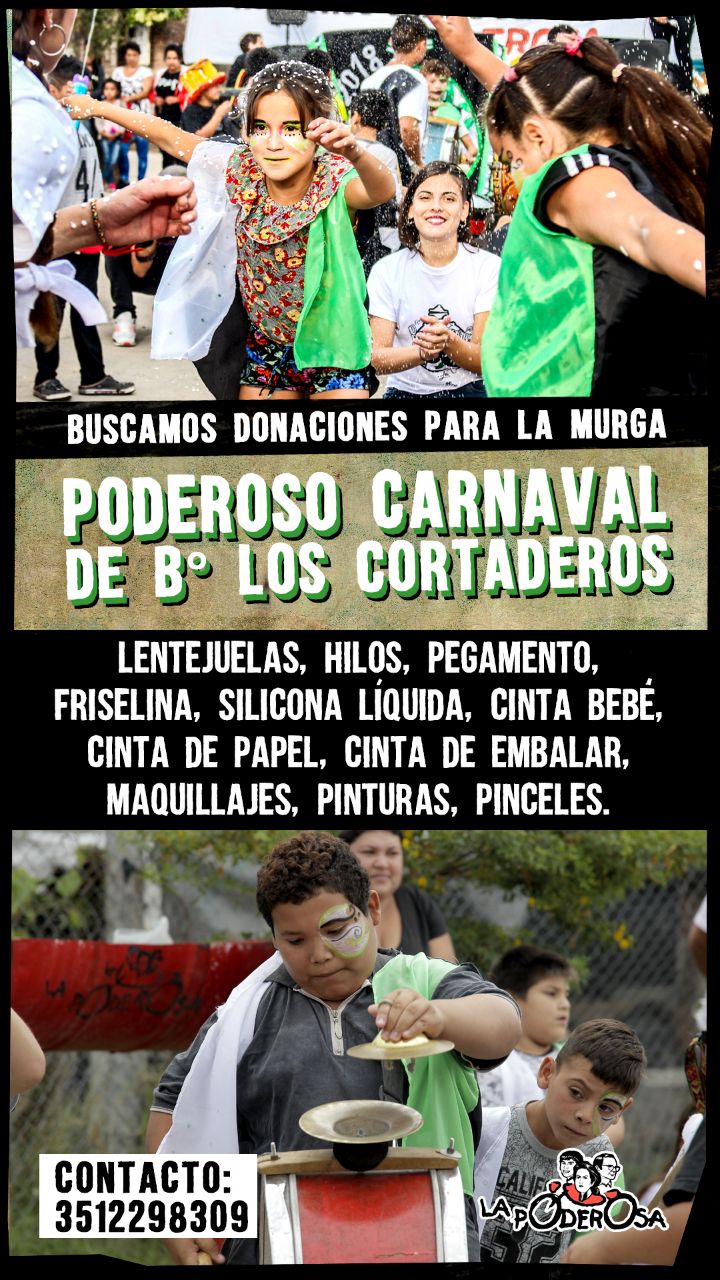 En el barrio cordobés Los Cortaderos hay una murga muy loca y descontrolada, el “Poderoso Carnaval”, que mete fiesta y nunca se cansa de bailar ni repiquetear los tambores. En esta época que ya huele a carnaval, los y las pibas nos preparamos para brillar, poniendo a punto los trajes, banderas, banderines, galeras, bombos, redoblantes y estandarte.