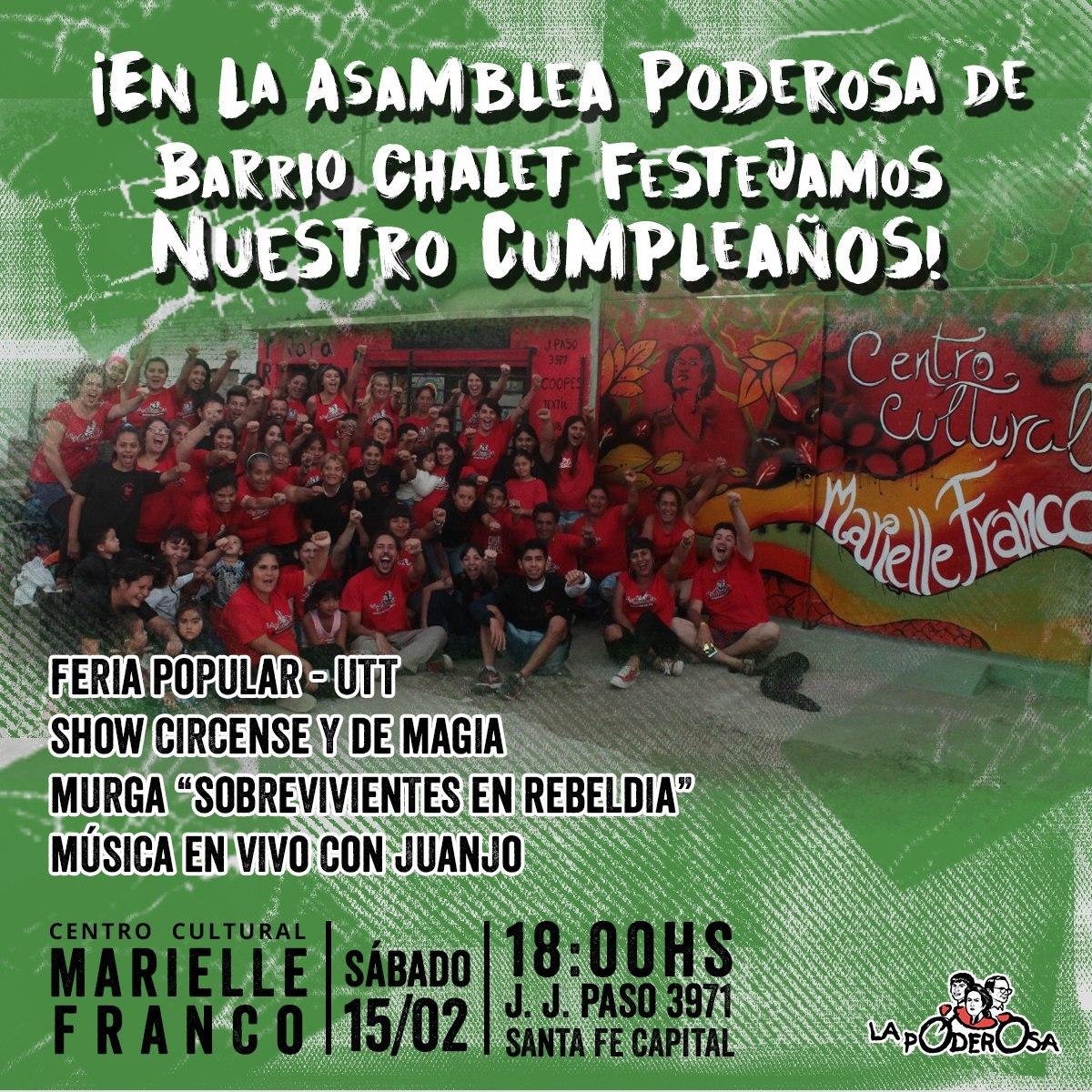 En la Asamblea Poderosa de Barrio Chalet, en Santa Fe, cumplimos años y queremos festejarlo a lo grande. Por eso, este sábado tendremos una edición especial de nuestra Feria Popular Poderosa, con actores de la economía popular, productos de nuestras cooperativas y verduras de la Unión de Trabajadoras y Trabajadores de la Tierra. También habrá show circense y de magia para la pibada, música en vivo y la presentación de nuestra murga «Sobrevivientes en Rebeldía».