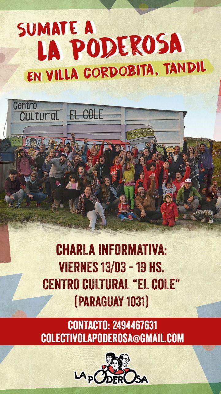 En Tandil, las compañeras y compañeros de La Poderosa nos encontramos en el barrio Villa Cordobita, en el Centro Cultural «El Cole». Actualmente tenemos nuestra asamblea vecinal, un espacio de apoyo escolar, de fútbol popular, un merendero, nuestra Biblioteca Popular “El Grito de la Sierra”, un espacio de comunicación popular, el frente de géneros y la «Murguita de los 7 Colores». También estamos construyendo la Casa de las Mujeres y Disidencias; un espacio de contención para las compañeras.
