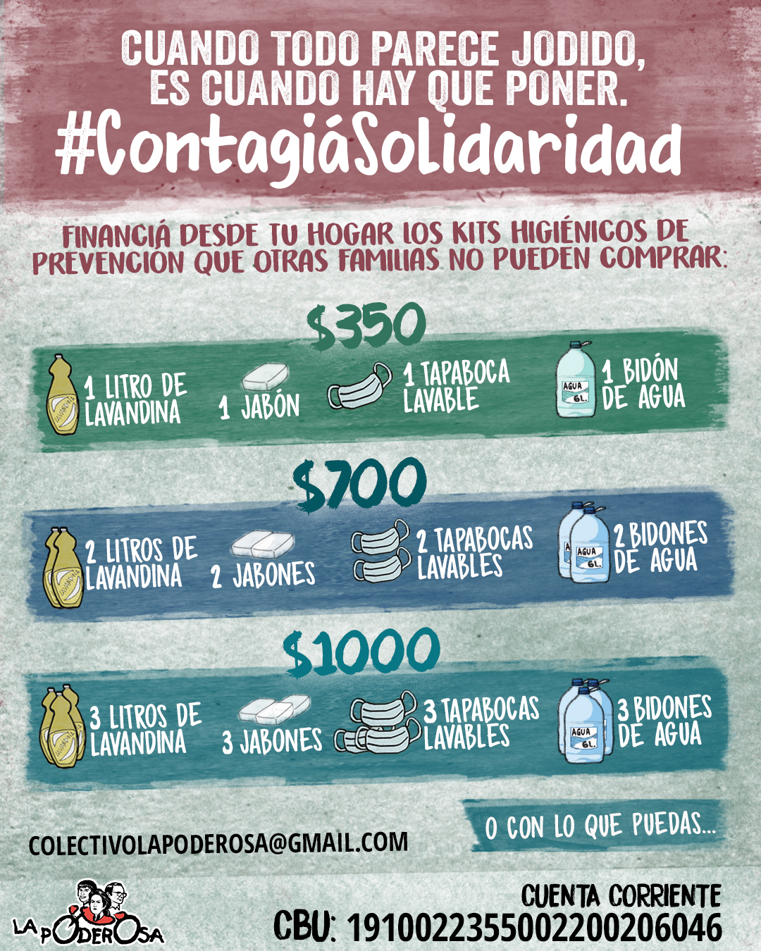 A fuerza de autogestión y gracias a las donaciones que nos hicieron llegar, pudimos sostener las ollas populares, los comedores y los merenderos que triplicaron su demanda. Pero todavía estamos viendo de qué manera cumpliremos las medidas de higiene, si no tenemos lavandina, jabón, alcohol en gel, ¡o agua! Continuamos buscando el modo de respetar el distanciamiento social en las casas donde vivimos hacinados y de resguardar a nuestras vecinas y vecinos que son población de riesgo. Ya lloramos la muerte de la madre de la primera contagiada; con sus 84 años vivía en una habitación con su hija y su marido; compartía baño con otras 11 personas. Contra todo, necesitamos que sigan contagiando solidaridad para poder afrontar esta situación que a muchas familias nos duele y que está empeorando.
