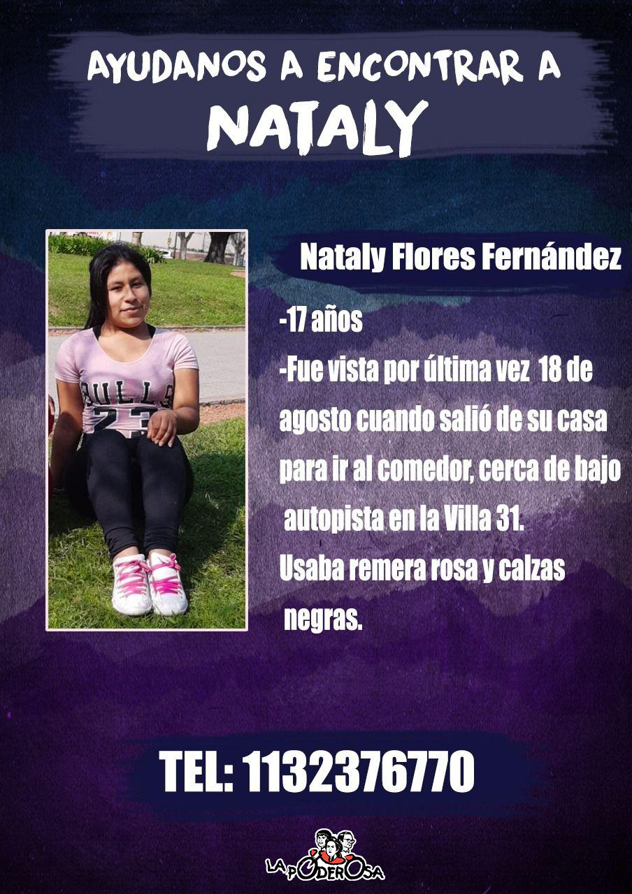 Buscamos a Nataly Flores Fernández, de 17 años, que fue vista por última vez el martes 18 de agosto cuando salió de su casa para ir al comedor cerca del destacamento de Bajo Autopista en la Villa 31, CABA.