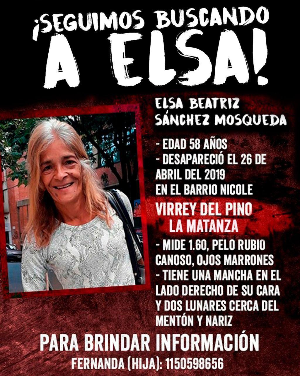 Ya pasaron más de 480 días y no bajamos los brazos en la búsqueda de Elsa Beatriz Sánchez Mosqueda, de 58 años. Fue vista por última vez el 26 de abril de 2019 en el barrio Nicole, Virrey del Pino, en La Matanza. Es de contextura física delgada, ojos marrones, cabello rubio canoso, mide 1.60 metros y tiene una mancha en el lado derecho de su cara, dos lunares en la nariz y en el mentón.