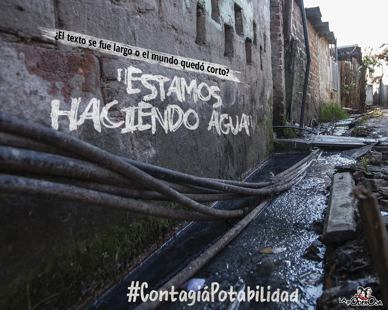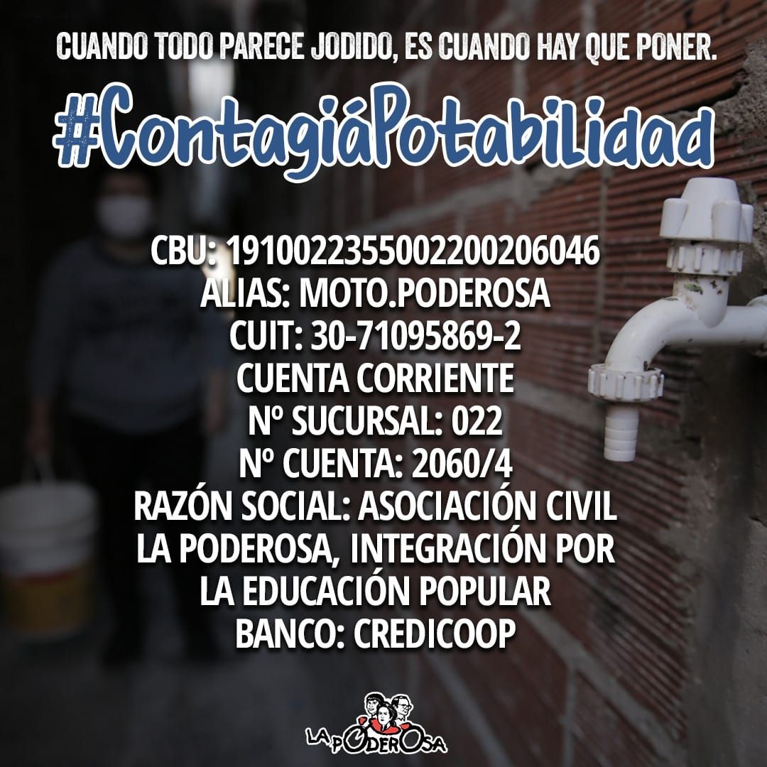 Y no sólo vamos a seguir gritando, vamos a seguir estornudando solidaridad y conectividad, echando luz, dándonos gas y contagiándonos potabilidad, hasta que la negligencia deje de ser tan «natural» como esta violencia ambiental que precede a la pandemia, bajo un modelo que sólo acopió agua para quienes, efectivamente sí, pueden lavarse las manos, que todavía no usaron para construir: sea la normalidad que sea, ¡la vamos a compartir! Porque sí, todavía quedan cínicos y tecnócratas con la cara lo suficientemente revocada como para cuestionar el acceso a la conectividad, pero el agua es un derecho que precede a la posverdad, ¡es la verdad! Un derecho que requiere de obras públicas y de responsables identificables, que no puedan volverse fantasmas difusos entre las convenciones de la sarasa internacional y nuestra rudimentaria vida real. Ni la queja pelada, ni la mera demanda, ni el voluntarismo onegeísta resolvieron, ni resolverán la falta de agua que nos hará desbordar. Pero por algún lugar hay que comenzar, no mañana, no ya mismo, ¡ayer! Así que discutamos cómo vamos a restablecer una infraestructura urbana pública, con caños, conexión formal y prestación igualitaria, pero mientras puteamos por la malaria o proyectamos materializar todo eso que soñamos, ¡dejemos de parlotear y hagamos!