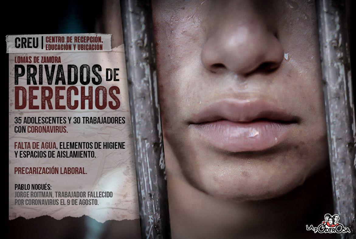 Desde los Centros de Recepción, Educación y Ubicación (CREU) de Lomas de Zamora y Pablo Nogués, dependientes del Ministerio de Desarrollo de la Provincia de Buenos Aires, nos llega el grito de adolescentes que transitan la pandemia encerrados en celdas frías, sin agua ni calefacción. Desde hace meses los trabajadores reclaman a la dirección del establecimiento y al Organismo Provincial de Niñez y Adolescencia que tomen las medidas sanitarias necesarias para prevenir focos de contagios, pero no los escucharon. ¿Adivinen qué pasó? El abandono mató a Jorge Roitman de Pablo Nogués, y ya hay al menos 30 laburantes y 35 pibes con coronavirus en Lomas de Zamora.