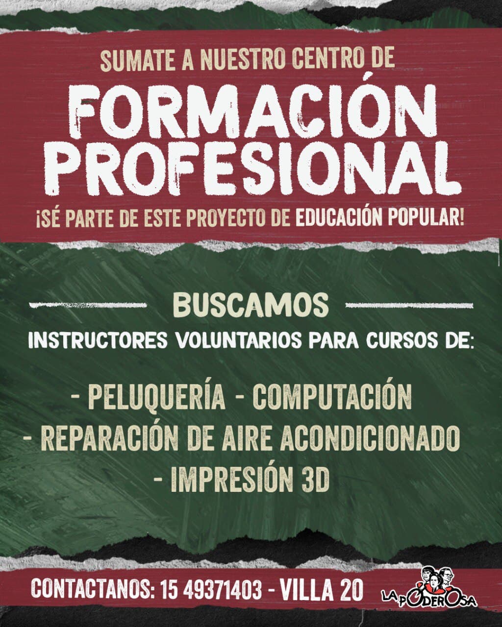 Tras sortear el 2020 con mucha militancia y compromiso, decidimos retomar el más importante proyecto que tenemos hoy dentro de Villa 20, Lugano: nuestro centro de formación profesional «Norma Colombatto». ¿Un espacio de capacitación, profesional y villero? Si, nada más y nada menos que un lugar autogestionado y cooperativo, en el cual vamos a tener la posibilidad de elegir un proyecto de vida propio. Porque no nos resignamos a lo que hay, porque queremos construir un lugar en el mundo basado en nuestros deseos e intereses, estamos buscando educadoras y educadores que ayuden a impulsar este sueño que crece y crece.