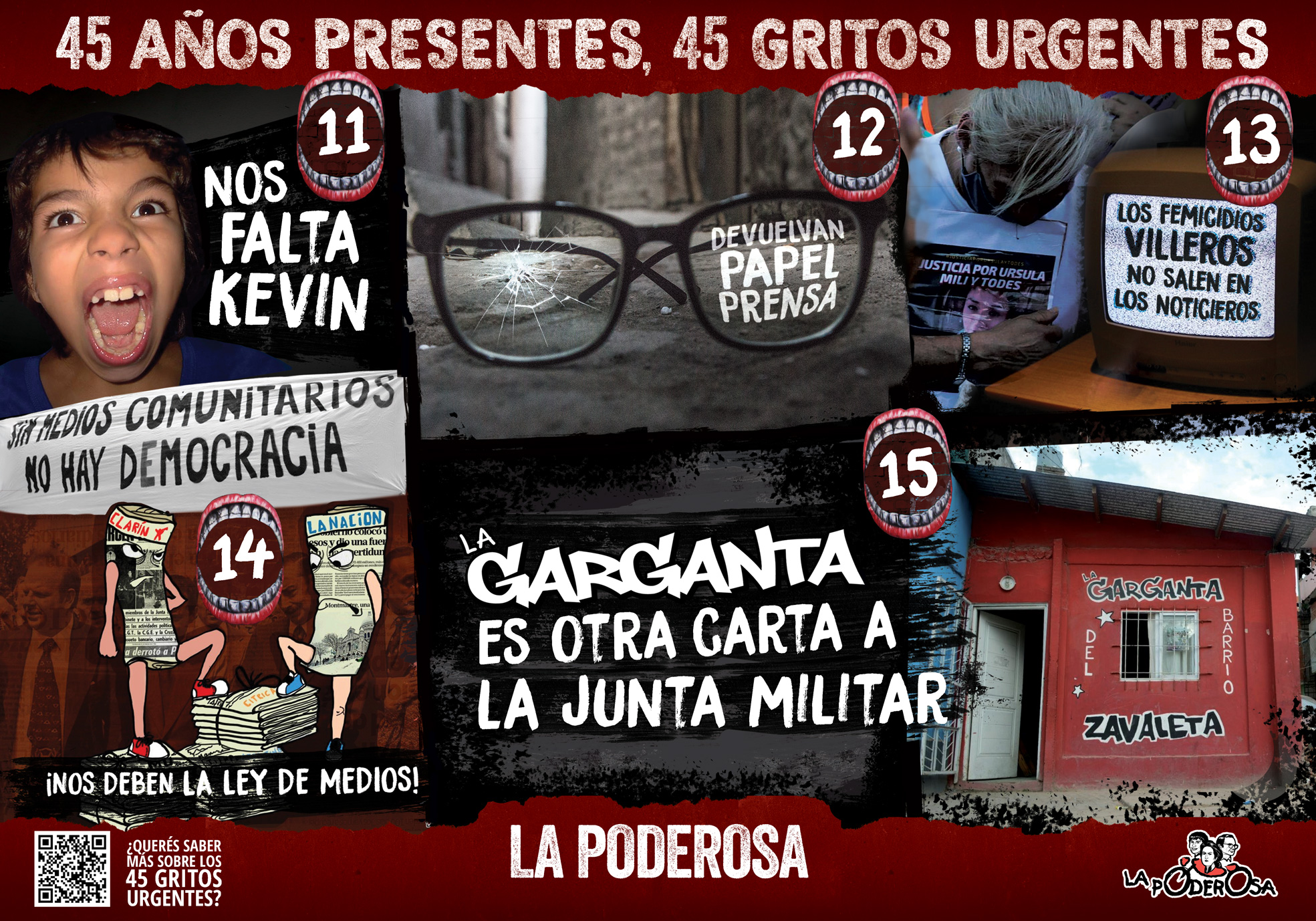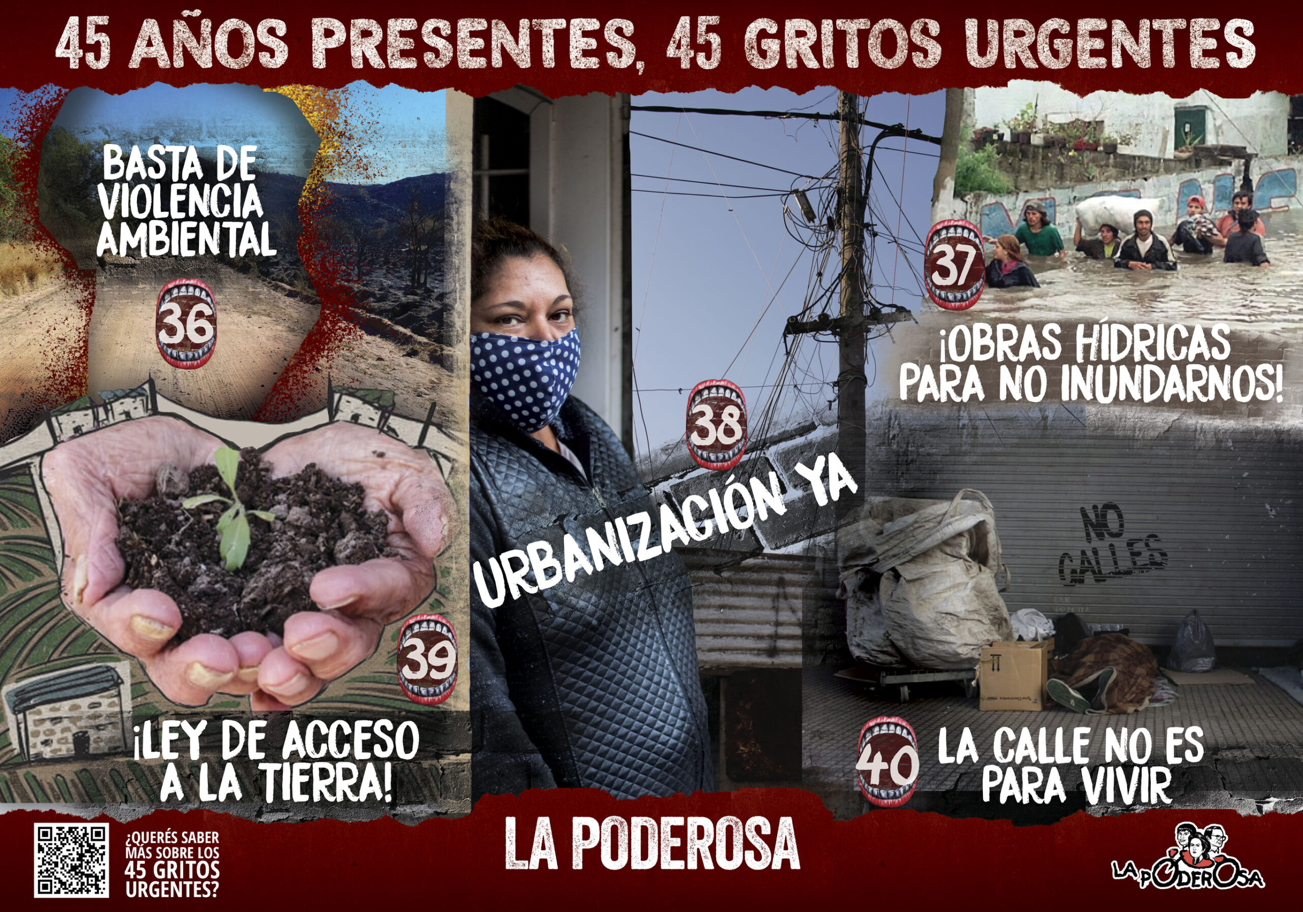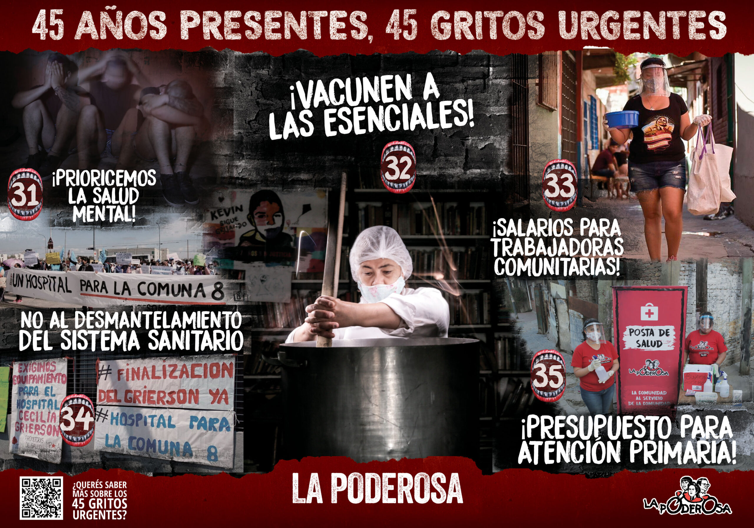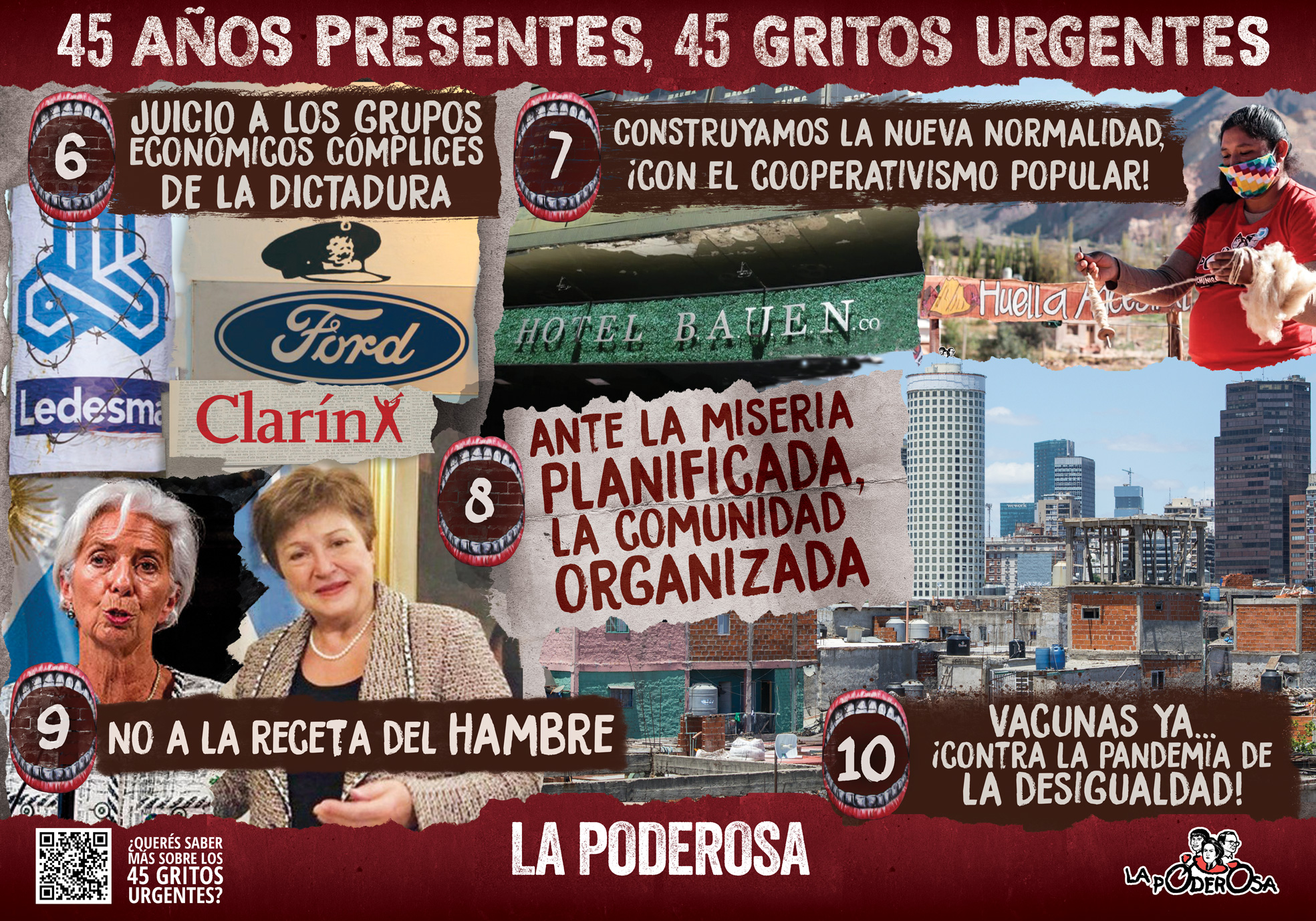 En cada uno de nuestros barrios, la noche más oscura del país atormentó mil pesadillas que perduran y se perpetúan. Pasaron 45 años desde aquel 24 de marzo de 1976: todos los pilares de la sociedad se fueron destruyendo; dejaron en terapia intensiva al sistema de salud, vaciaron la economía, arrasaron con el derecho a la vivienda, censuraron la libertad de expresión, robaron hasta el último gramo del papel prensa, se llevaron todas las tizas de la educación, desaparecieron nuestros derechos, trataron de ocultar 30 mil verdades, fusilaron el futuro, encerraron disidencias y nos quisieron acostumbrar a vivir en la indigencia. Toda esa destrucción que sigue como herida abierta en la sociedad, son nuestros 45 gritos urgentes para una nueva normalidad.