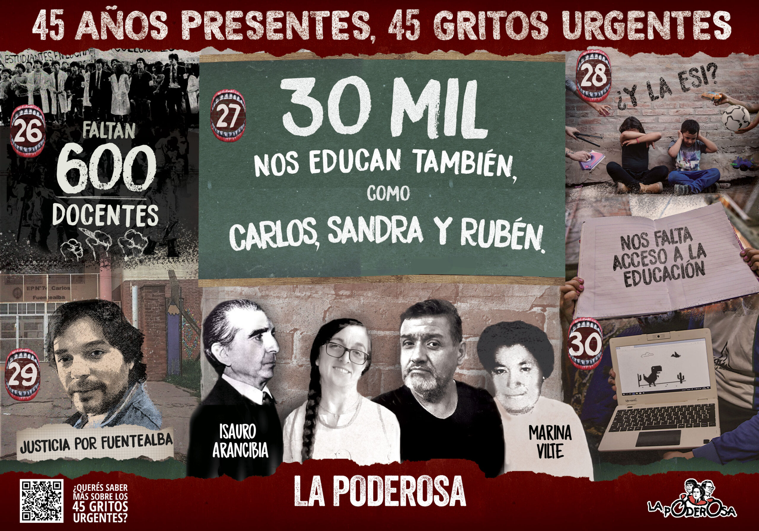 Durante la última dictadura, la educación fue uno de los sectores más golpeados, perseguidos, controlados y censurados. El mismo gobierno de facto escribió el boletín “La subversión en el ámbito educativo: conozcamos a nuestro enemigo” que se repartió en todas las instituciones educativas. Tanto estudiantes como docentes, fueron denunciadas y denunciados como consecuencia de esta política mediante las intervenciones dentro de los espacios educativos de todos los niveles durante esos años. Esto provocó que 600 docentes sean detenidos y desaparecidos. Por ellas y ellos, gritamos desde las barriadas populares: por los 600 docentes de nuestra historia, ¡continuidad pedagógica de la memoria!