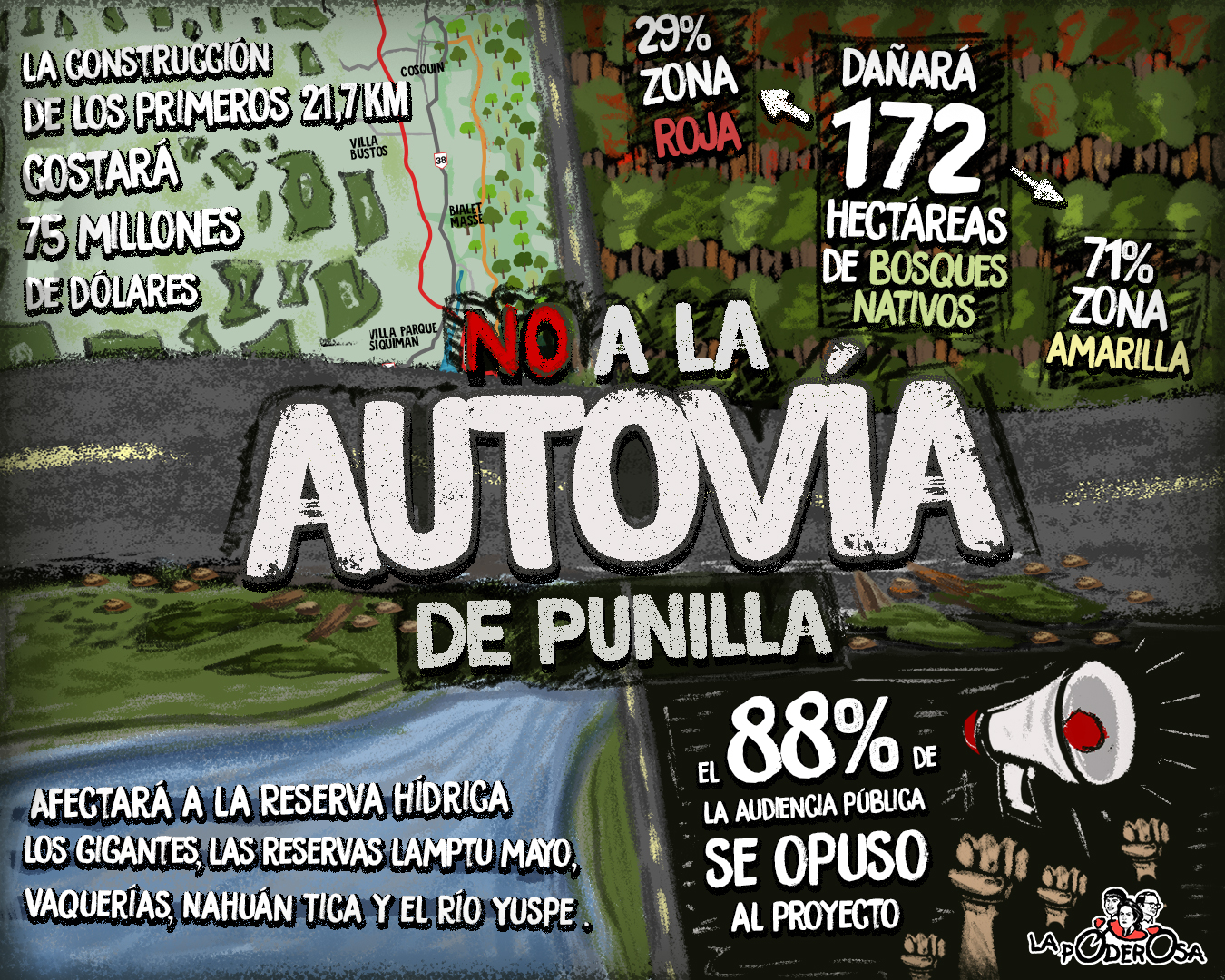 El gobierno de Córdoba busca imponer una obra de 43.5 km de Autovía en el Valle de Punilla. Una vía de comunicación entre diferentes pueblos para que circulen transportes pesados y ligeros, una vena abierta que no nos “llevaría al progreso”, sino que afectará 172 hectáreas de bosque nativo, a la Reserva Hídrica Los Gigantes y el cruce de los ríos Yuspe y Cosquín. Estas obras traerán más pesar al ambiente de la provincia, que ya sufre una pésima gestión ambiental: nos quedan menos del 360 mil hectáreas de bosque nativo donde antes había 12 millones. Aun así, la destruccion del ambiente no cesa, porque sólo en 2020 ya sangró el ambiente cuando los incendios forestales arrasaron una superficie que supera el equivalente a cinco veces la Ciudad de Córdoba. Sin embargo, el 23 de diciembre se presentó el nuevo trazado de Autovía de Punilla.