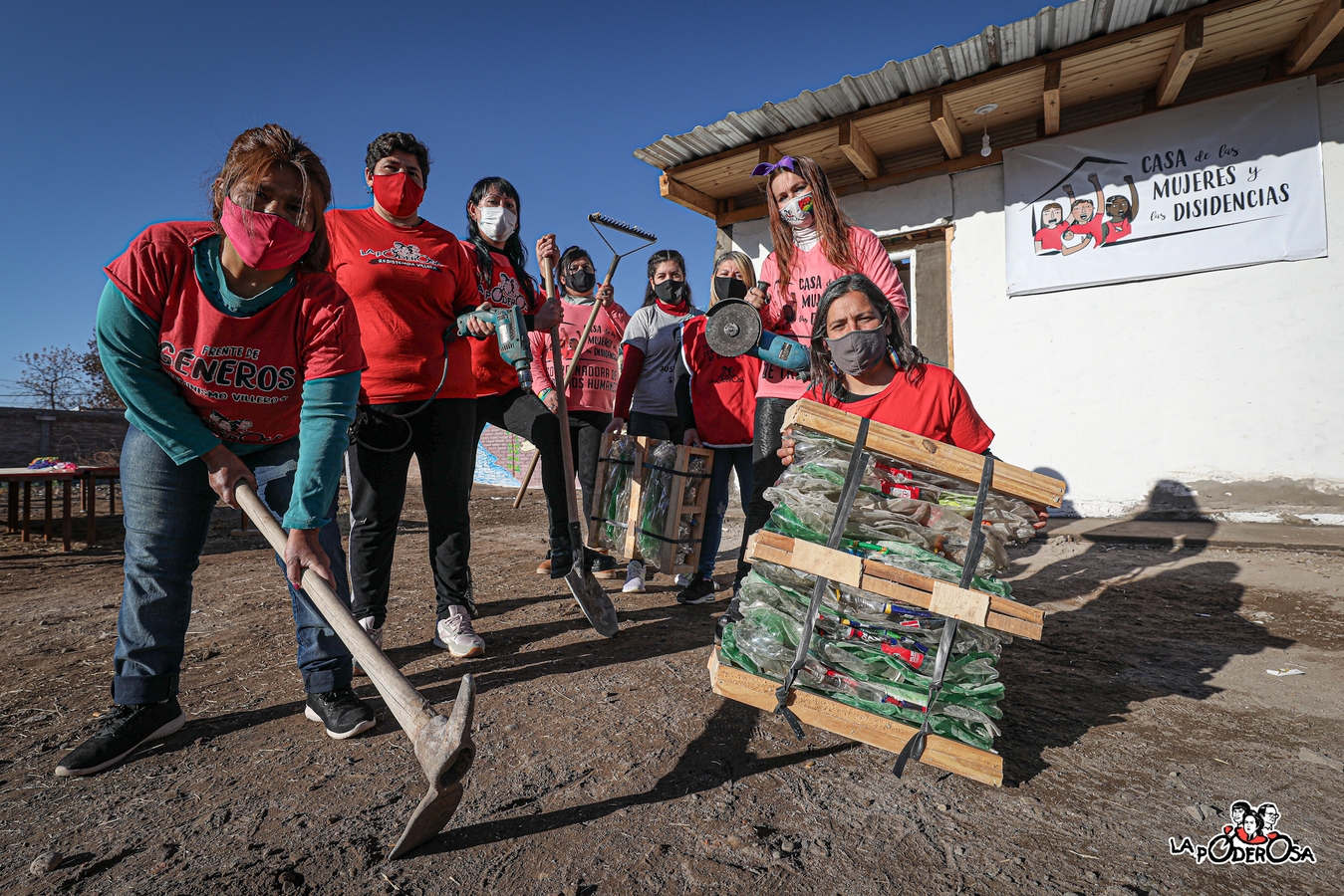 Hoy las negras, las pueblerinas, las villeras, las tortas, las travas, las originarias y las campesinas nos vestimos de orgullo con nuestro propio color: en San Rafael, Mendoza, cerquita de la Cordillera de los Andes, el mismo grito sororo brota de nuestro feminismo villero en toda la Argentina. Quizás usted no lo sepa, pero mientras la pandemia nos destrozaba a todas y se multiplicaban las violencias que teníamos que acompañar, no dejamos de juntar botellas descartables. ¡Eso mismo! De las calles, de algún basural, de lo reciclado, levantamos nuestras paredes con el método de construcción llamado “Módulo de Plástico Recuperado Autoportante” y fabricamos las columnas, las vigas y cada ladrillo con la fuerza de la autogestión. Este sistema, además de permitirnos edificar una Casa propia y sustentable, aporta mucho al saneamiento ambiental de la ciudad porque tratamos los residuos sólidos y urbanos. Con la frente bien alta y una alegría que nos desborda, ¡inauguramos nuestra octava Casa de las Mujeres y las Disidencias!