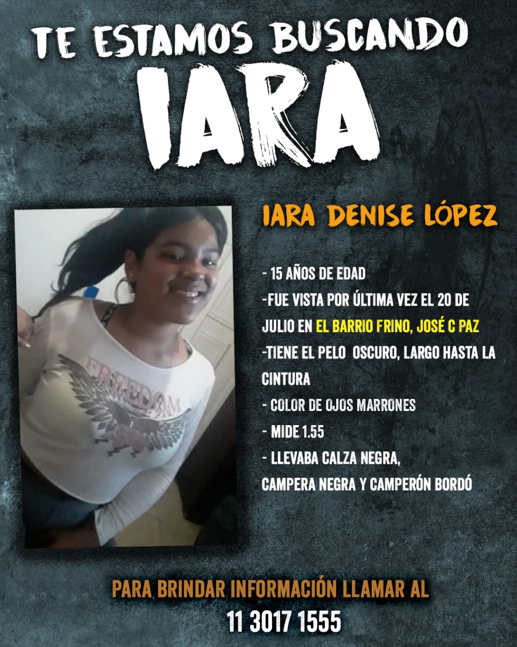 El 20 de julio, Iara Denise López, de 15 años, fue vista por última vez cuando se dirigía a la estación de José C. Paz. Llevaba puesta una calza negra, una campera negra y un camperón bordó. Mide 1,55, tiene pelo oscuro, largo hasta la cintura, y ojos marrones. Cualquier dato o información, llamar al 1130171555.