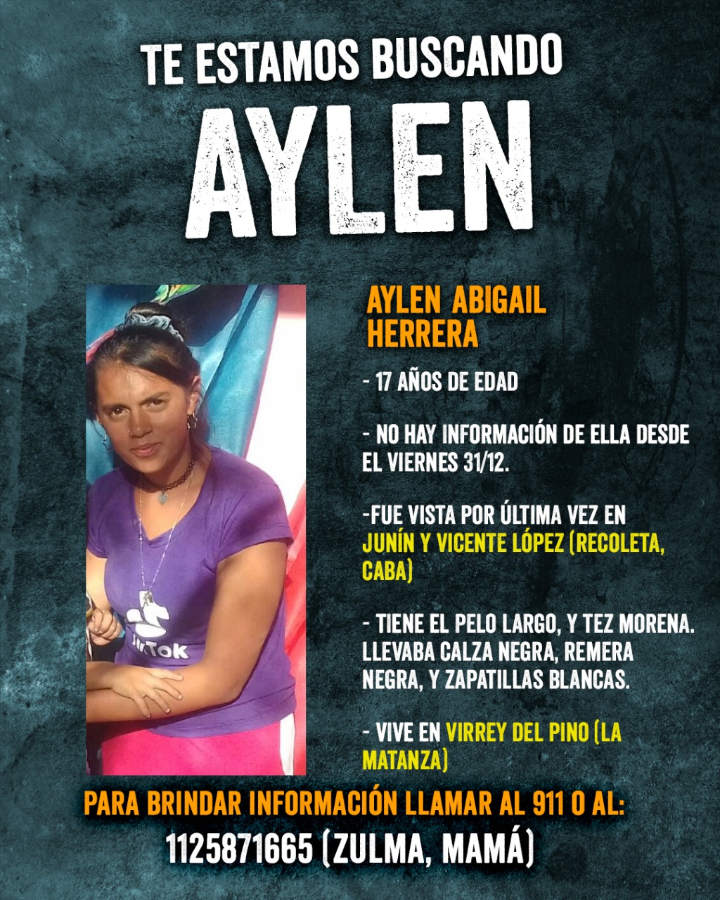 Fue vista por última vez el 31/12/2021 en Junín y Vicente López (Recoleta, CABA). Es de Virrey del Pino, La Matanza. Vestía calza negra, remera negra, y zapatillas blancas. Es de tez morena, y pelo largo.