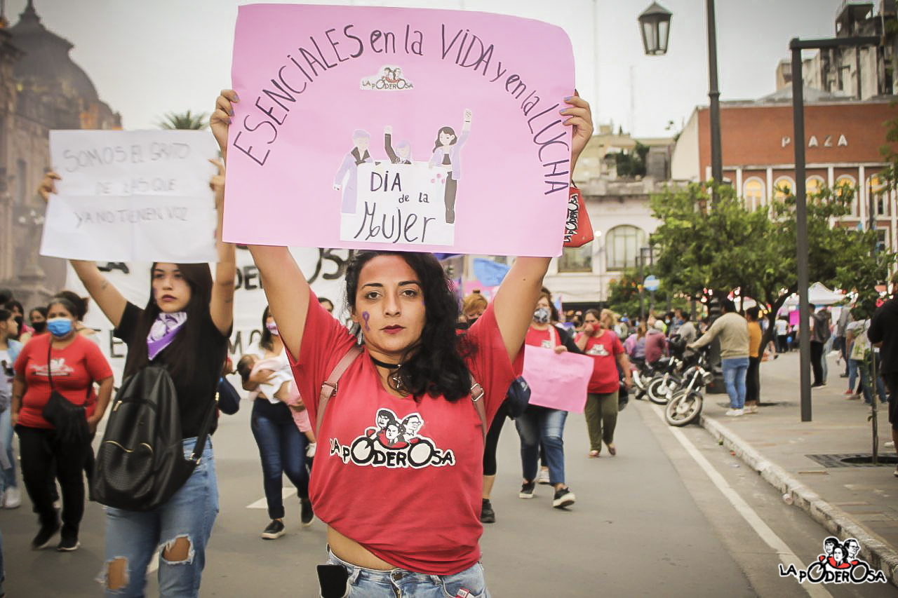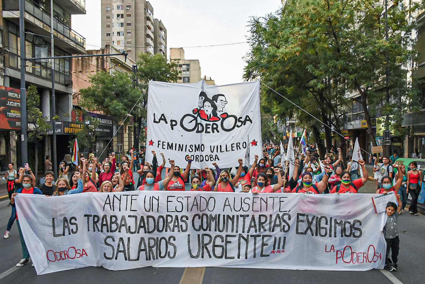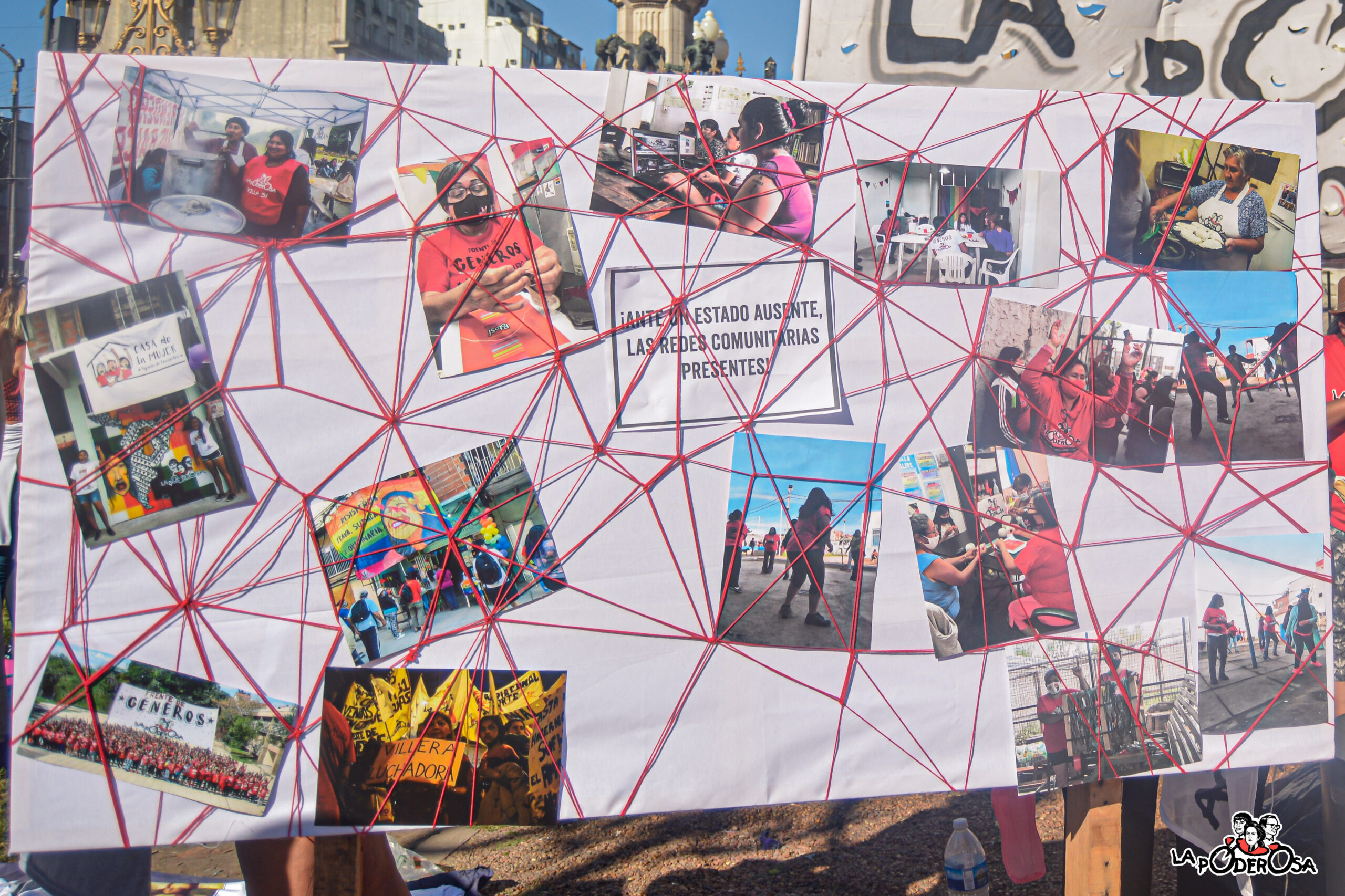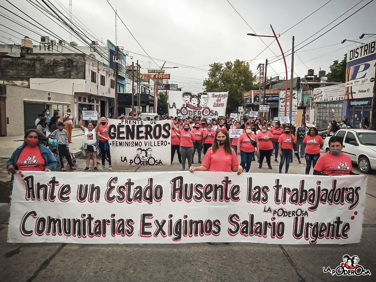 En las veredas, la gente detenía su rutina diaria, su trayecto hacia algún lado, para ver los carteles; mientras nosotras sosteníamos bien en alto el nuestro: “hoy más que nunca es necesario parar, necesitamos reconocimiento salarial”. En pancartas, en el cuerpo, plasmadas en la ropa, las consignas traían a la memoria una lucha que es de todas. Cada vez que mirábamos la calle multitudinaria, recordábamos a las que faltan: cada paso que damos es en el nombre de todas. Nos encontramos entre risas las que picamos la verdura en el comedor, las que servimos la merienda, las que nos sentamos en la mesa con los funcionarios a reclamar los recursos para el barrio, las que sacamos fotos, las que en la remera llevamos a Sabina como consigna, las que llevamos el rostro de Marielle, las que no olvidamos a Ramona, las que golpeamos el redoblante como si no hubiera un mañana, las que apenas nos mirábamos y llorábamos de emoción.